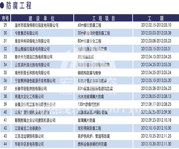 宏順建設(shè)工程有限公司是國家批準(zhǔn)成立的專業(yè)高空作業(yè)企業(yè):承攬過(國內(nèi).國外)煙囪新建、煙囪防腐、磚煙囪新建、煙囪改造、煙囪維修、煙囪脫硫防腐、煙囪拆除加高、煙囪滑膜等高空作業(yè)工程。具有“不搭腳手架 、 不需要停產(chǎn)”施工特點(diǎn)。
